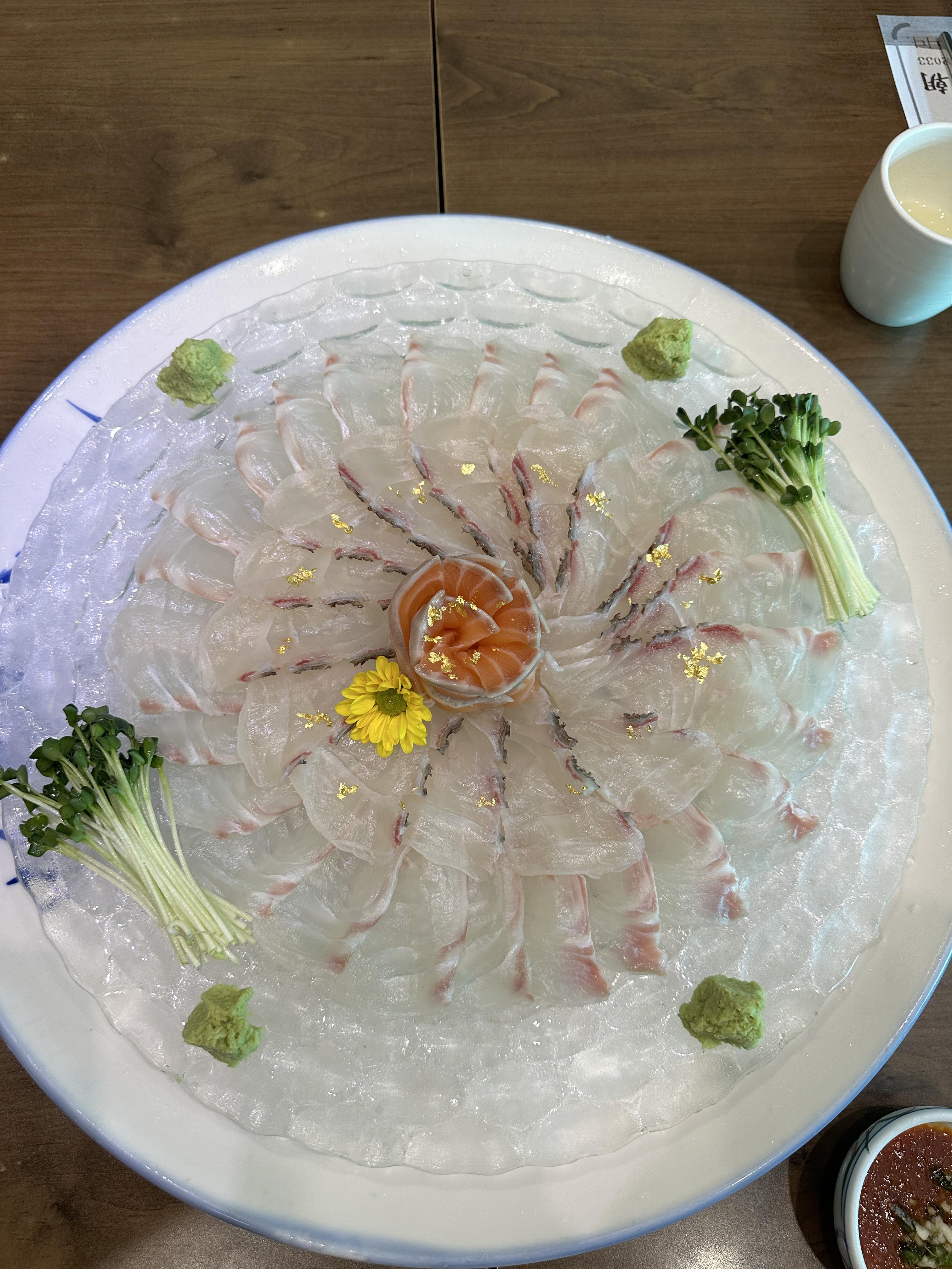 우선 대게찌는 동안에 먼저 나온 회..도미회와 도미숙회 그리고 연어도 작게 나왔다.