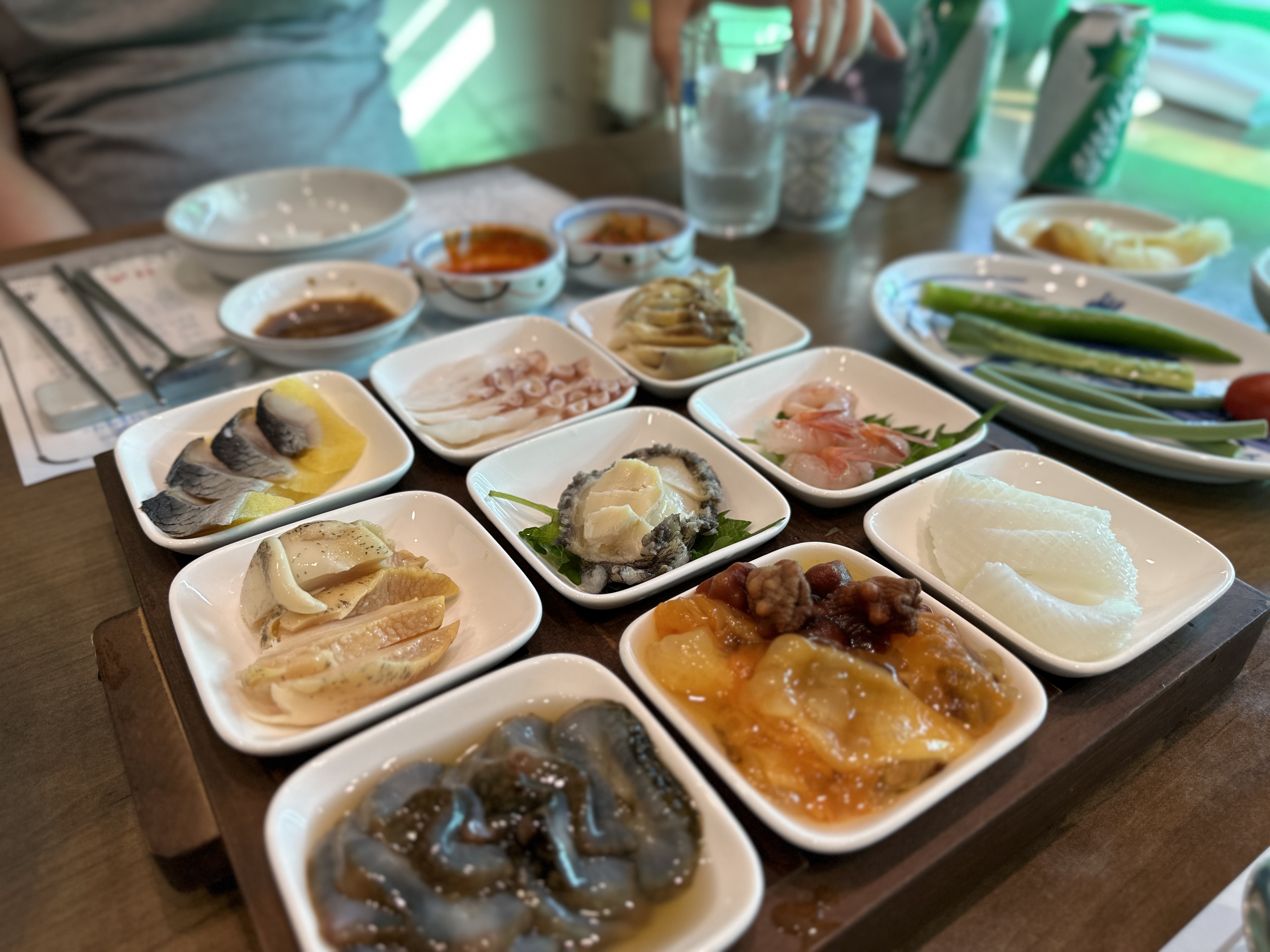 함께 나온 해산물 세트...멍게, 새우회, 해삼, 전복 등 다양한 종류가 먹기 좋게 나왔다. 임산부가 있어도 익힌 음식이 있어서 다행~